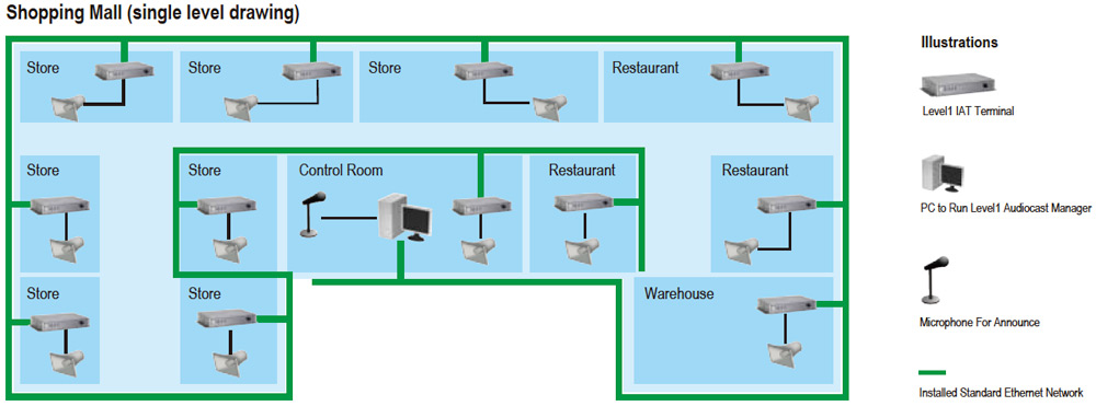The IP Audiocast System uses broadcast streaming to send audio to each IAT-1000 terminal on the network. As noted in the shopping mall above, each audio zone can receive any MP3, WAV, playlist (M3U), or live announcement streamed from the control room. This allows users to configure each zone to receive music that is different from the others, providing a truly flexible audio solution. |